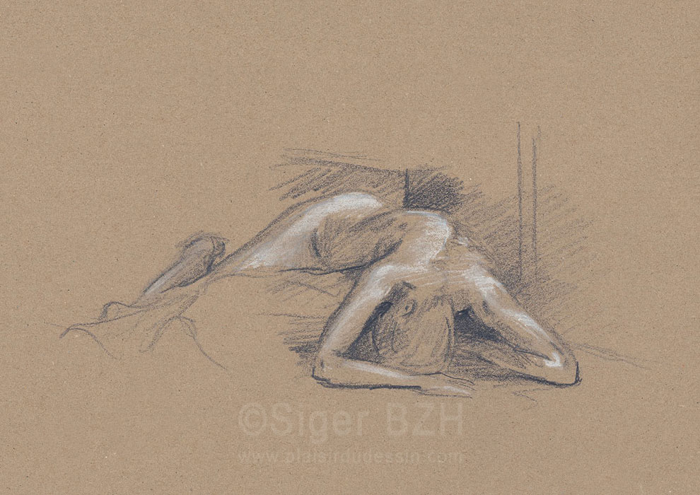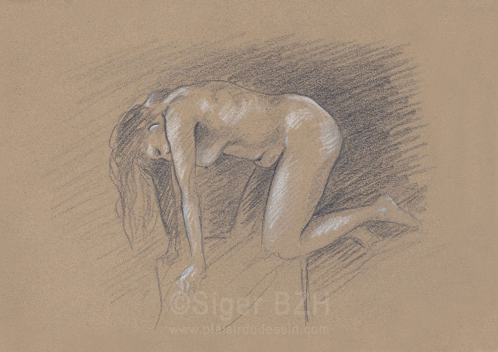 le croquis j’aime beaucoup car c’est rapide il y a souvent beaucoup de dynamique dans une esquisse plus que dans un crayonné classique. quand j’étais plus jeune pour m’entrainer j’ai beaucoup dessiné des sculptures (elles ne bougent pas ;o)). comme j’ai eu la chance de pouvoir aller au Louvre j’ai adoré les esclaves de Michel Ange et se fut un déclique alors je me suis mis au modelage et j’ai travaillé des corps dans la torture et la souffrance. La force qu’il y a dans ces sculptures m’a toujours fasciné, cette façon d’aller de la pierre brute, qui en progressant vers le haut va vers la finesse et la transcendance des traits à la patine parfaite ça vous prend les trippes on sent jaillir la sculpture du bloc c’est magnifique j’ai essayé de traduire cela au crayon dur d’avoir la même force il faut que l’esquisse progresse dans la mise en scène du tableau pour finir en fin de lecture par un fini d’une grande finesse avec ombres en dégradé et contrastes appuyés. j’ai fait quelques tableaux ainsi qui sont des piétas (encore une inspiration de Michel Ange : La piéta di Roma, juste la perfection) mais on a de jolis effets en mélangeant crayon et électronique par exemple http://www.jihelge.fr/conventionnel/galeries/coupdgueule/original/pieta-2-2.jpg