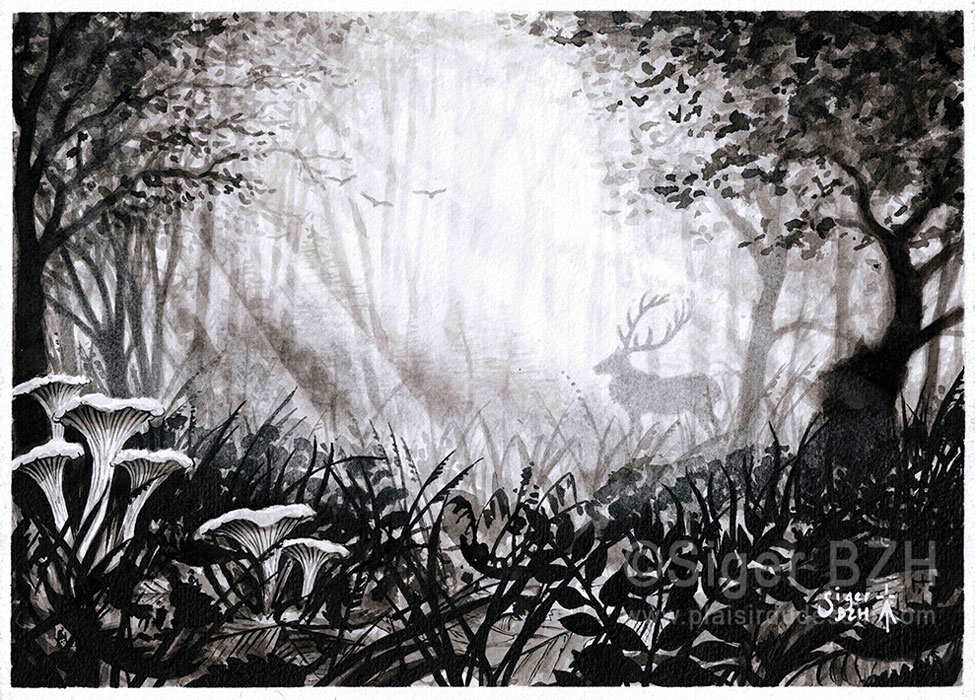Girolles et cerf - Encre de Chine - Siger BZHGirolles et cerf - Encre de Chine - Siger BZH
